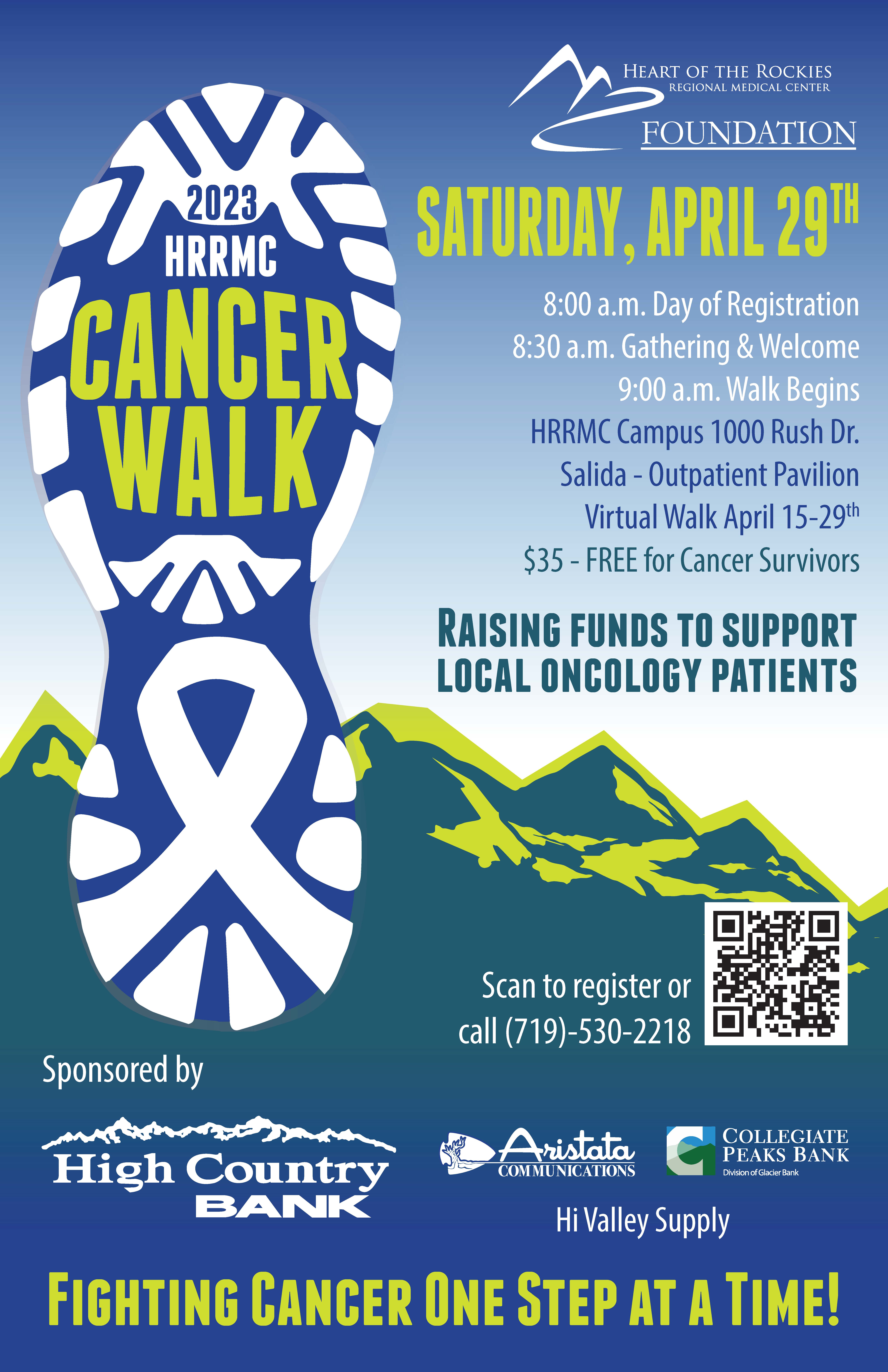 We appreciate everyone who contributed through sponsorships, donations, participation, and volunteering! A special thank you to Heart of the Rockies Radio Group’s sponsorship that included a wonderful social media promotion created by Ximena! Thank you to this year’s thoughtful sponsors who helped cover costs of the event: High Country Bank, Performance Tours Rafting, Agile Rehabilitation Services, Collegiate Peaks Bank, Colorado Mountain Solar, HRRMC Auxiliary, Topo Coffee, Veer Graphics, Xi Epsilon Delta, Hi Valley Supply, Thriving Lotus Healing, 7,000 Feet Running Company, the Carillot Family, Dr. Dan Wardrop, HRRMC Dermatology Clinic, Sangre de Cristo Electric Association, Natural Grocers, and Gone to the Dogs. We also appreciate all of our bakers and buyers from our Cancer Walk Bake sale at HRRMC on April 2. Thank you to Chloe and Clara for our Kids’ Craft Corner! We appreciate the Mountain Mail’s coverage of the event. Every contribution makes a difference!