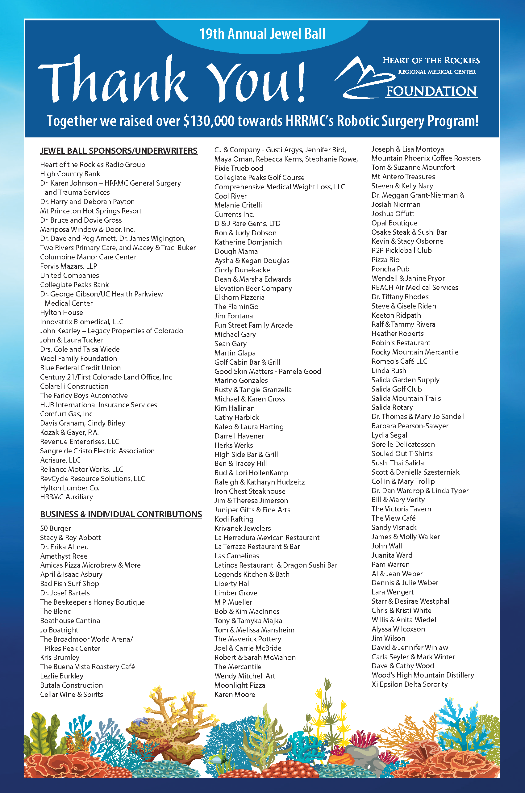 Thank you to all of our Sponsors, Underwriters, donors and attendees. Together we raised over $130,000 to support HRRMC's Robotic Surgery Program. Your generosity makes a difference to our 8,000 square mile region and to the future of healthcare here at home.