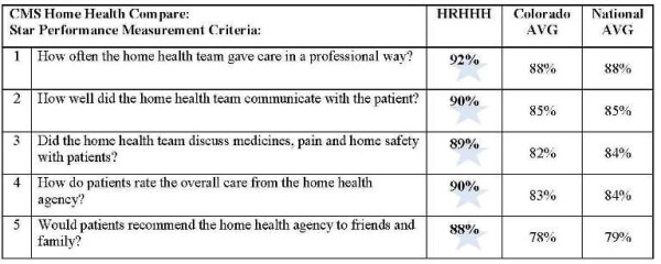 Heart of the Rockies Home Health and Hospice (HRHHH) recently received a five-star patient care rating through the Centers for Medicare & Medicaid Services (CMS) Home Health Compare. The star rating is based on performance measures that evaluate patients' experience with home health agencies and compare them to state and national averages. Five stars is the top ranking.
