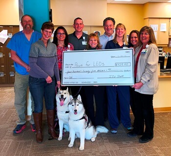ICU staff at Heart of the Rockies Regional Medical Center gives a $425 holiday gift to nonprofit Paws For LEOs on Dec. 21. LEO stands for Law Enforcement Officer. Paws For LEOs, based in Buena Vista, trains service dogs for law enforcement officers, emergency service providers, firefighters and first responders who have been physically or mentally injured while on active duty. Hospital administrators joined ICU staff members as they presented the check to Paws For LEOs Founder and CEO Marianne Maes. Pictured (L to R) are Mark Risinger, Maes, dogs Rasty and Tara, Shalin White, Jeff Dolgan, Foundation Director Kimla Robinson, CEO Bob Morasko, Gail Ryan, VP Patient Services April Asbury and ICU Manager Charlie Engelman.