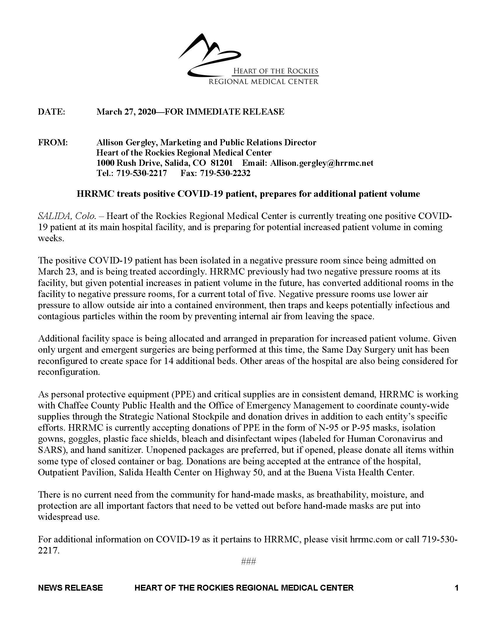 DATE: March 7, 2022—FOR IMMEDIATE RELEASE FROM: Lezlie Burkley, Foundation Director Heart of the Rockies Regional Medical Center Foundation 1000 Rush ...