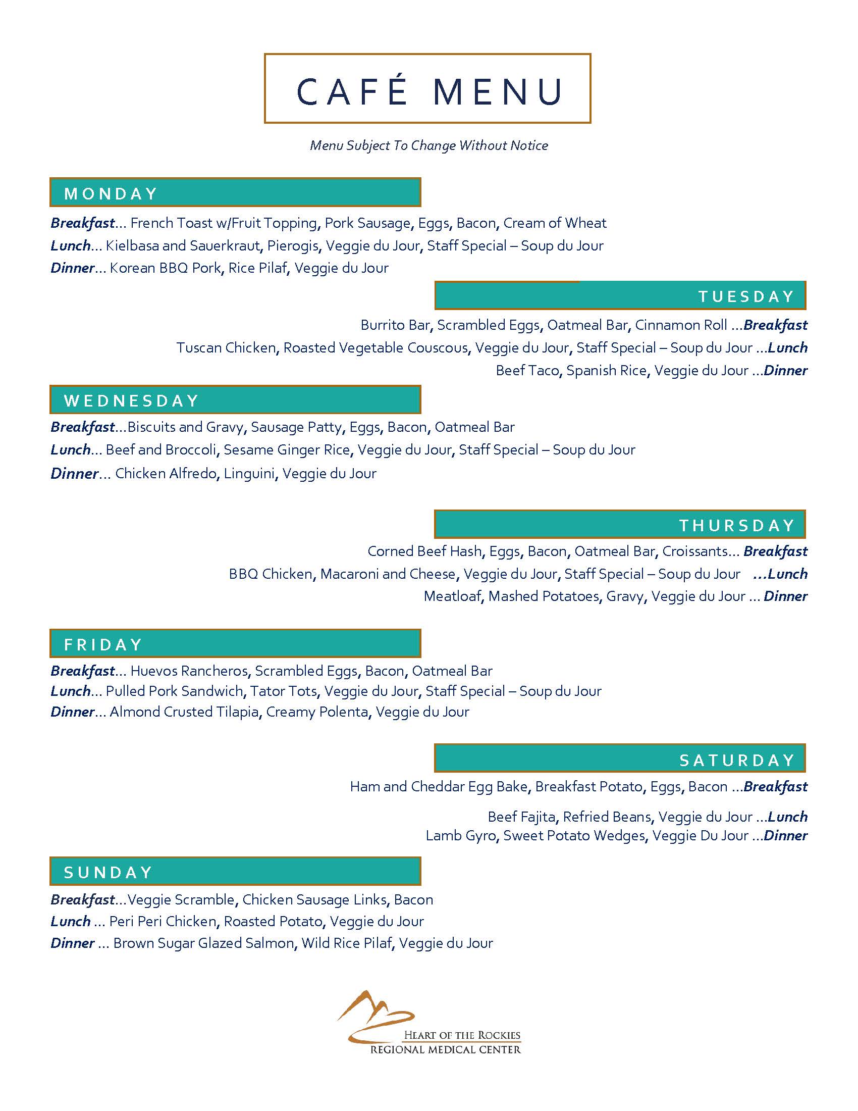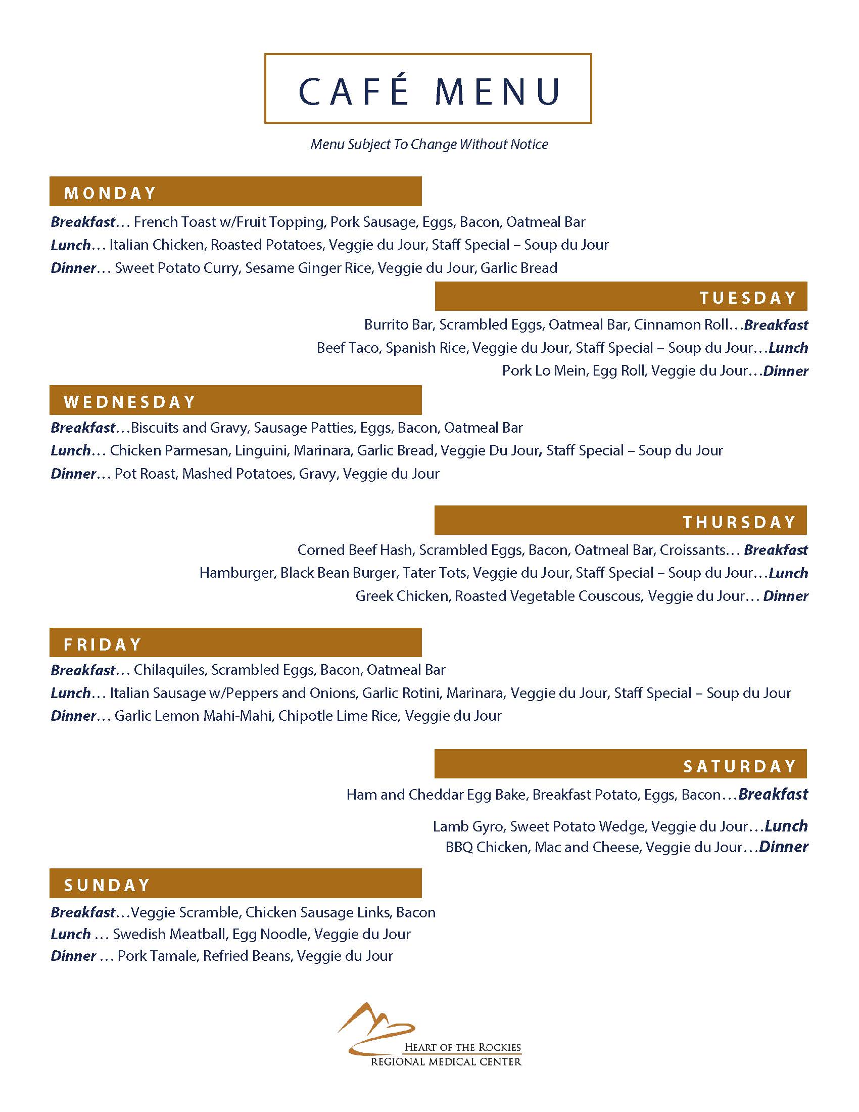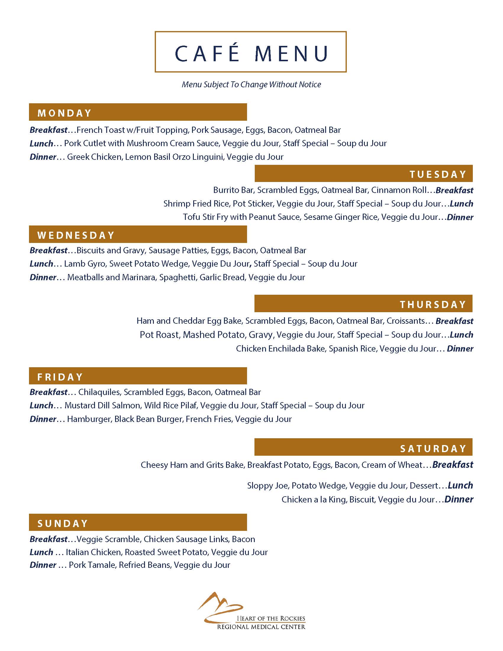 The hospital Café offers wholesome, nourishing and well-balanced meals and is located on the first floor on the south side of the building. A salad bar, grab-and-go salads and sandwiches are available in addition to the daily menu items.