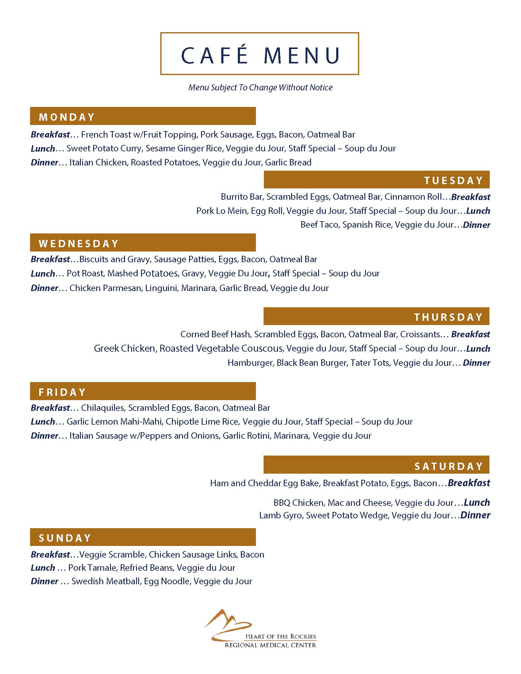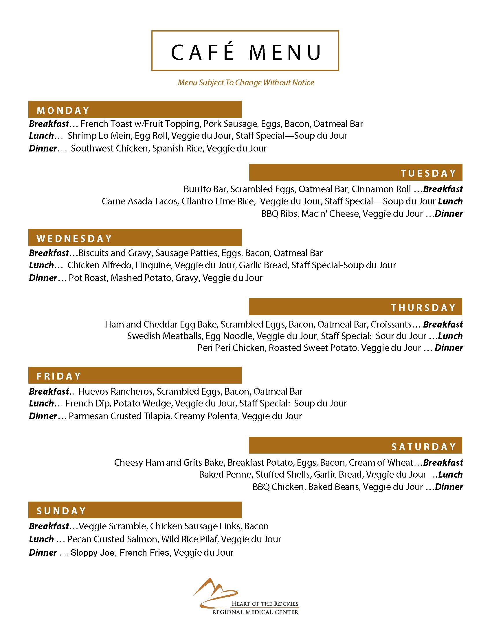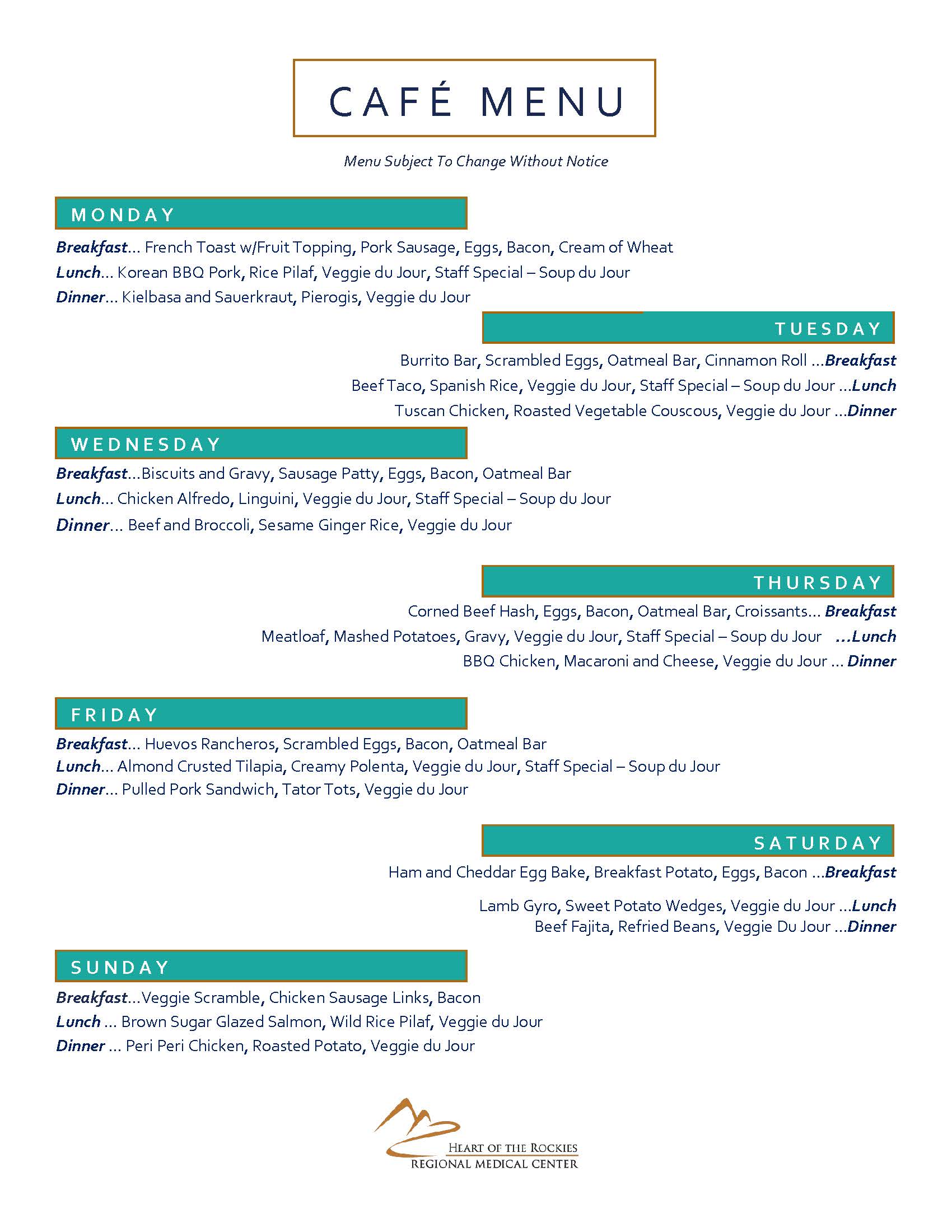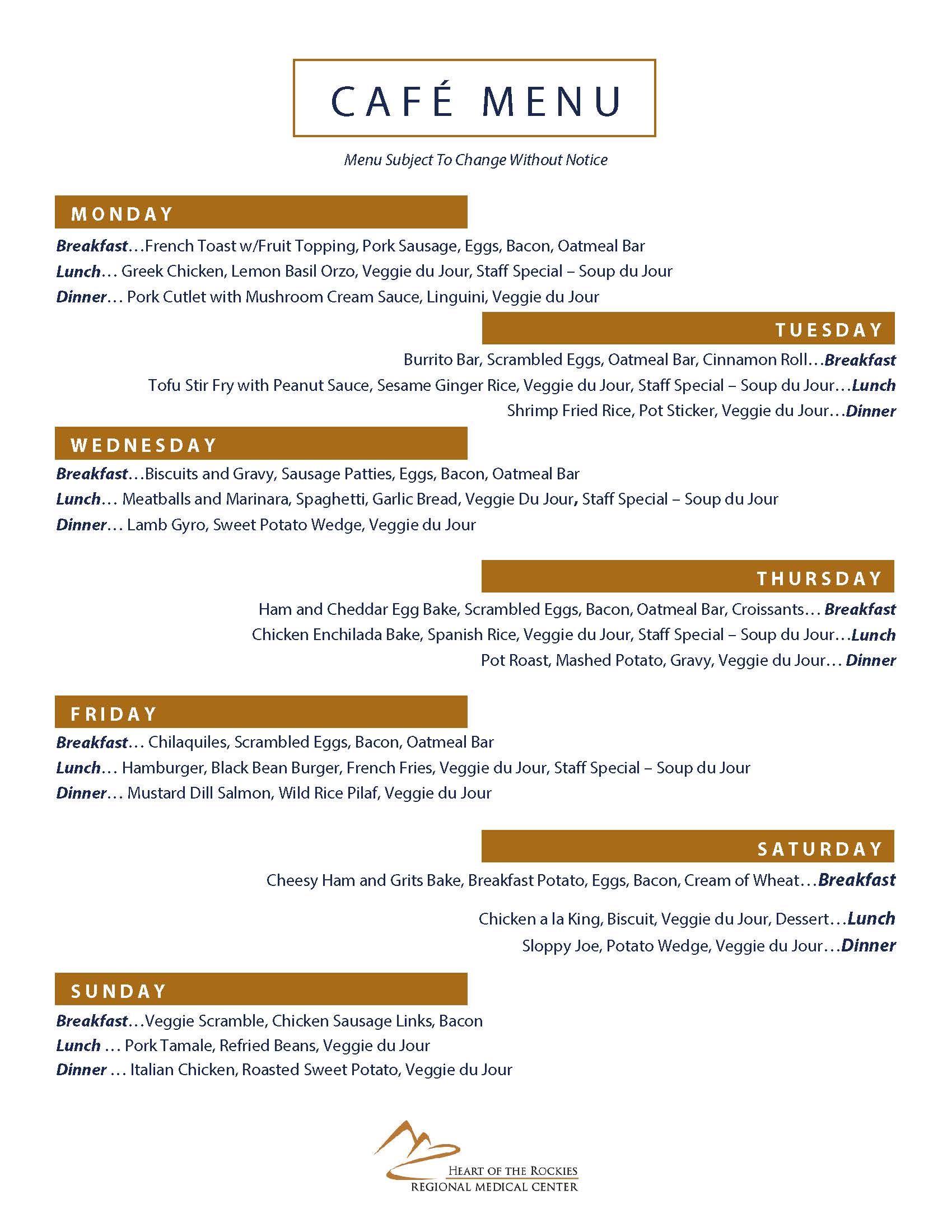 The hospital Café offers wholesome, nourishing and well-balanced meals and is located on the first floor on the south side of the building. A salad bar, grab-and-go salads and sandwiches are available in addition to the daily menu items.